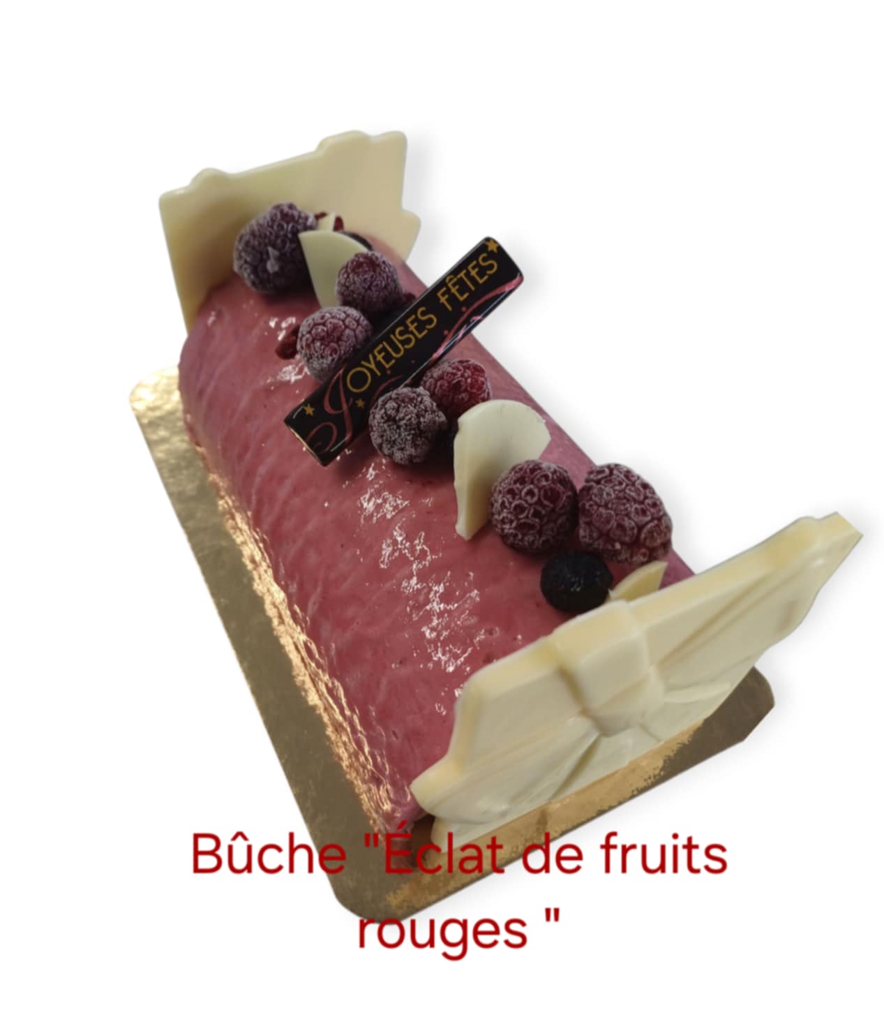 Bûche glacée composée de biscuit amande, croquant spéculoos, crème glacée framboise, coulis cassis.