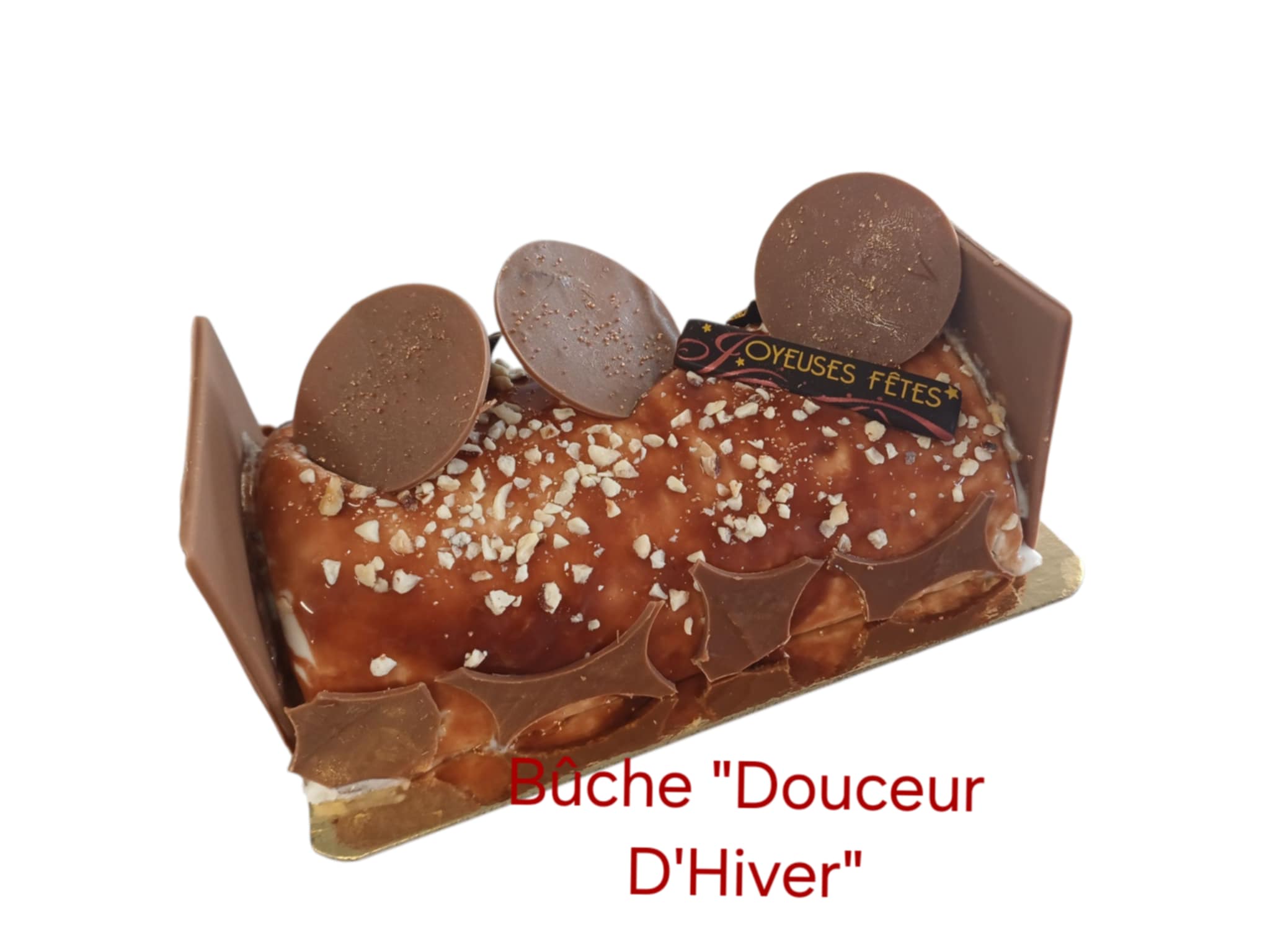 Bûche glacée composée de Brownie, croquant praliné, crème glacée Vanille, crème glacée noisette, crémeux praliné.
